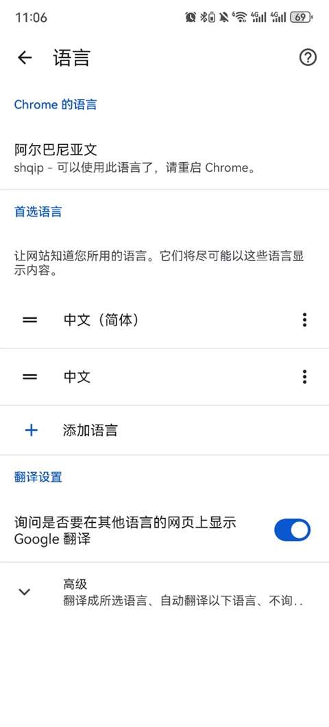 6、选择后会回到上一个界面,并且下方弹出重启Chrome的提示,我们点击【Restart Chrome】即可,之后重启谷歌app,我们就可以发现软件内已经变成中文界面了。
