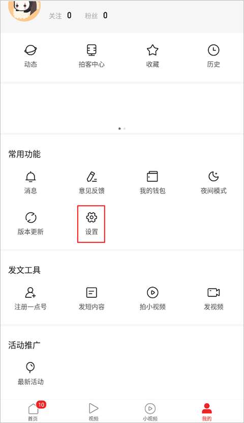 1、转到我的页面,单击“常用功能”下的“设置”。