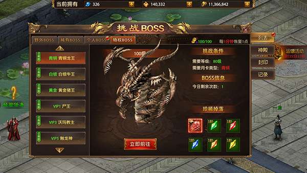 2、每天必须挑战特权BOSS,特权BOSS不但可以掉落游戏宝石,BOSS召唤令等道具,还可以掉落热血神钻,热血神钻可作用与热血装备系统,大幅提升角色属性实力。