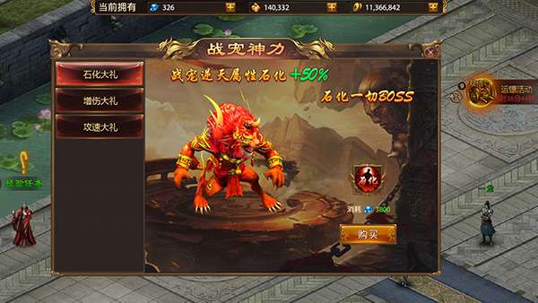 3、推荐优先购买战宠神力,可以获得石化,切割,攻速这三种战宠永久BUFF,可以极大的提升升级打怪的效率,其次推荐购买神力租赁可以获得大量属性,进一步提升升级打怪的效率。