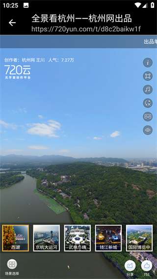 3、点击右上角的搜索按钮,如搜索杭州,可以看到杭州的全景。点击进入。