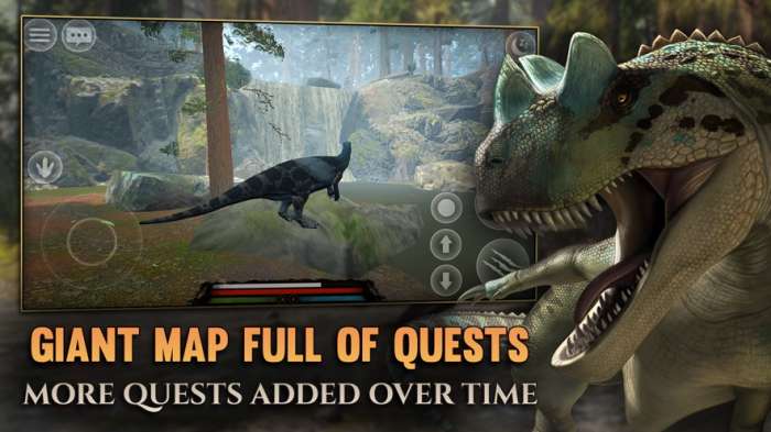 1、单独一人在这里控制着恐龙行走,可以跟着和自己的种族一起寻找食物,也可以独自参与搜寻的任务;
