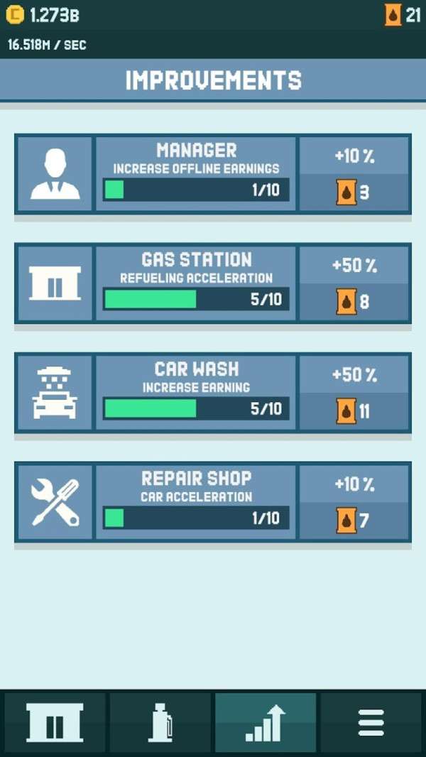 像素加油站在游戏的板块中大家经营着属于自己的汽车加油站,在这个像素的城市中有不同的需求为了满足整个城市的运转需要开始慢慢的升级扩建增大经营的规模还有增加新的经营板块。产物多了就会有很多的收益,比方说修理店有的车辆出现了故障就会来到你的店铺寻找修理的项目。之后就是洗车板块,可以在最初增加一项活动,加油就可以有一次免费洗车的机会。