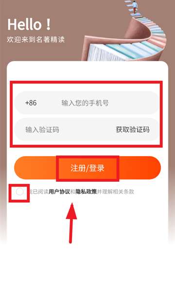 2、跳转到登录界面后,输入手机号,验证码,勾选我已阅读用户协议和隐私政策并理解相关条款,点击登录/注册即可。