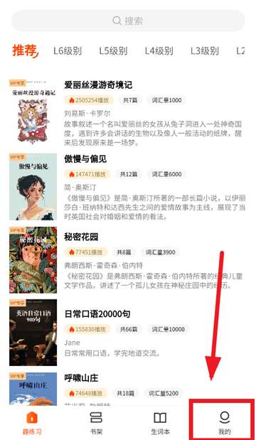 1、在本站下载安装并打开双语名著精读app,进入趣练习首页后点击我的。
