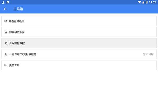 3、点击右上方的工具箱菜单,有查看版本,卸载谷歌三件套,清除数据等功能