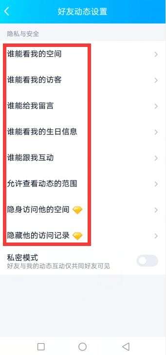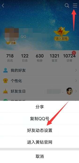 在空间主页的右上角,单击[≡](三个水平条)图标,然后从下拉菜单中选择[好友动态设置]。