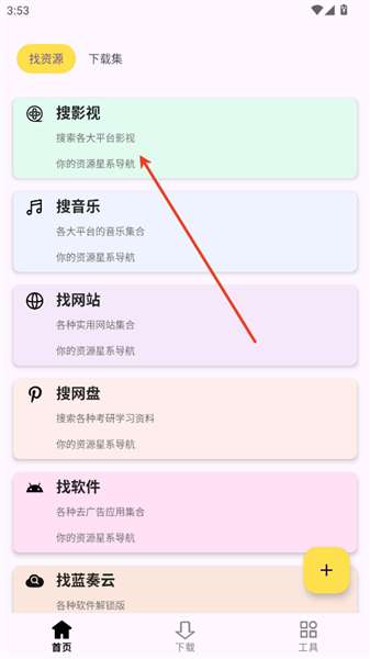 1、在软件首页点击搜影视板块。