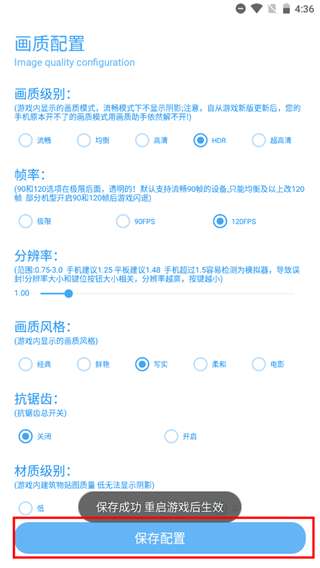 4、选择好自己想要的配置,点击“保存配置”,重新打开游戏即可。