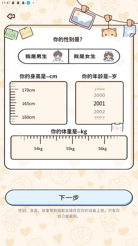 1、首先,在此处输入您当前的身高、年龄和体重信息。
