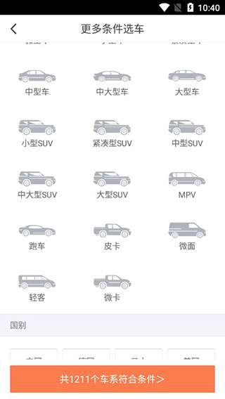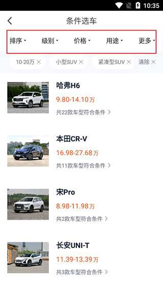 4、点击“更多”设置多个筛选条件,包括价格范围设置、车辆级别设置、国际、自动或手动、排量等。