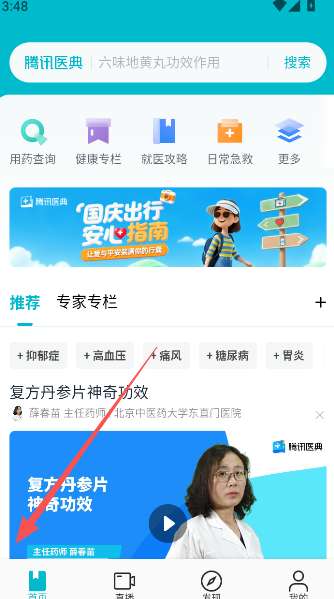 1、主页为用户提供药物咨询、健康专栏、医疗指南和日常急救等医疗知识。