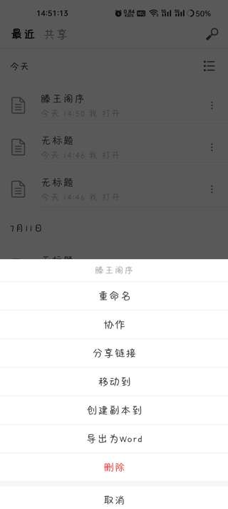 6、编辑后的文档将保存在最近列表中,并自动保存在云中,可以导出为Word文档。