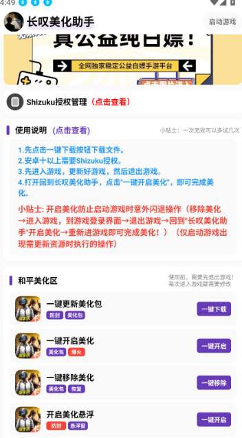 长叹美化助手app是一款免费好用的游戏美化包软件。可以随时开启和移除,支持各种美化效果,如枪支、服装、车辆等,而且网络上流行的美化包也可以直接使用。有了它,游戏界面、角色、服装等内容都可以一键美化,完全免费,给你带来极佳的视觉体验,当然,美化后的操作也非常流畅。无需复杂的操作,只需一键就可以快速激活各种游戏美化效果,简单高效地设置,瞬间刷新视觉体验。