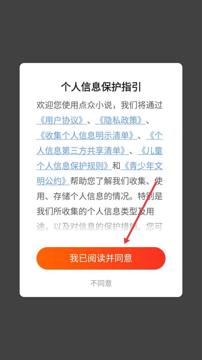 1、使用点众小说前,需阅读个人信息保护指引相关内容,同意后可进入应用畅享阅读。