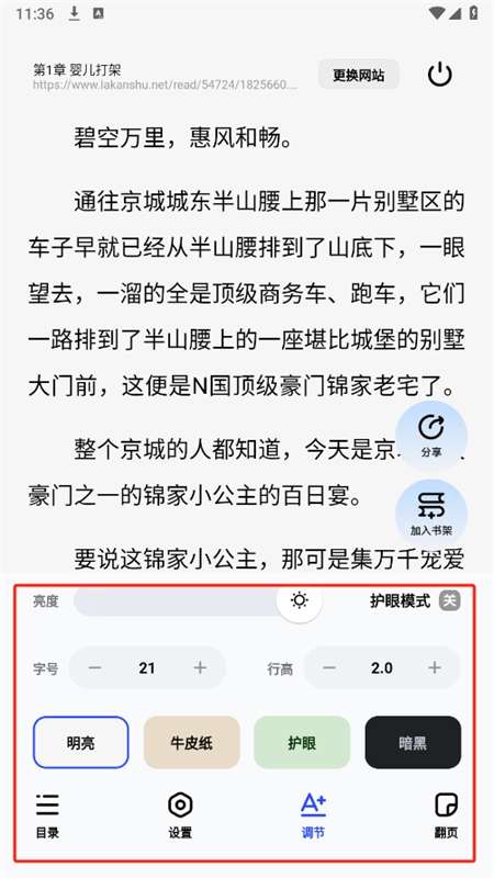 4、进入阅读界面后,可以根据阅读习惯调整字体的大小、背景等设置。