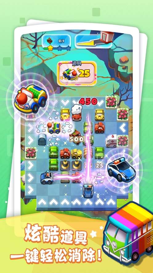1、这里的游戏玩法除了连线三个相同的之外,还要根据买一个汽车的车头方向,消除后他们会自动的进行某个区域的驾驶。