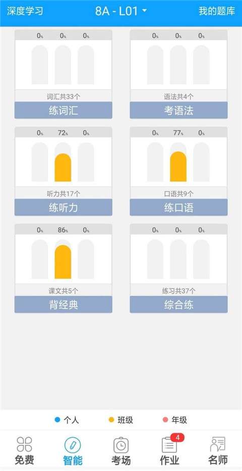 5、【智能】里面有每单元的词汇、听力、拓展、语法等智能练习,智能专项和辅导。(智能专项练习辅导,查漏补缺,保持好成绩)。