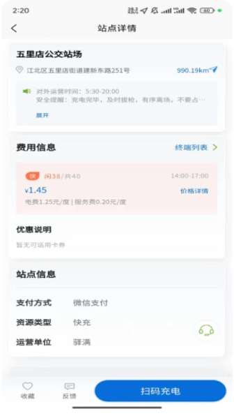 2、【个人中心】 可以查看网站的详细信息,包括充电桩数量、距离、电费、支付方式、开放时间、物业类型、停车数量等。