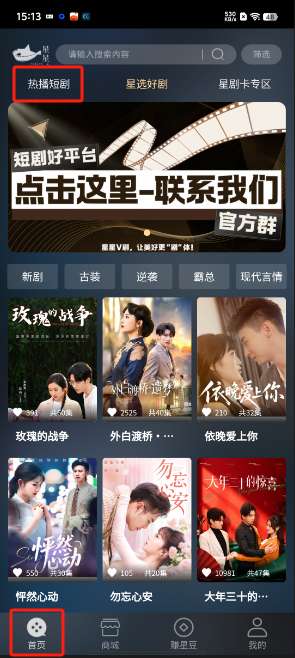 1、打开软件进入首页,找到页面上的“热播短剧”。