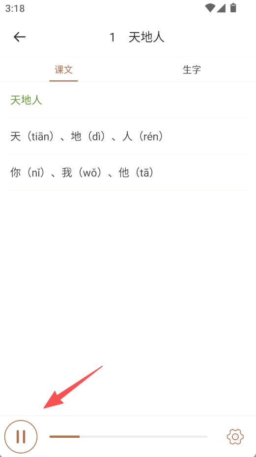 3、进入内容页面,可收听课文音频,也能点击暂停键控制播放。