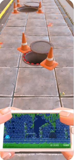 1、在手机中要去完成不同障碍的跨越以及收集金币,然后再模拟现实里要控制人物角色去躲避一些挖的坑,以及井盖。