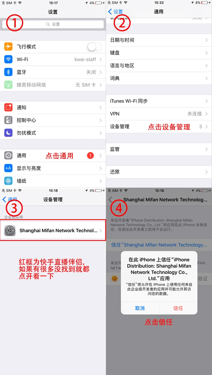 4、在设置中进行应用信任:进入设置-->通用-->描述文件与设备管理-->找到IOS直播伴侣-->选择信任-->完成