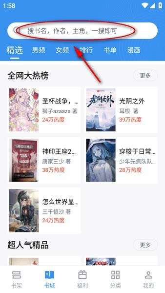 1、给书籍换源首先进入app后,来到搜索加入一本小说,软件无论是小说还是漫画都可以观看哦。