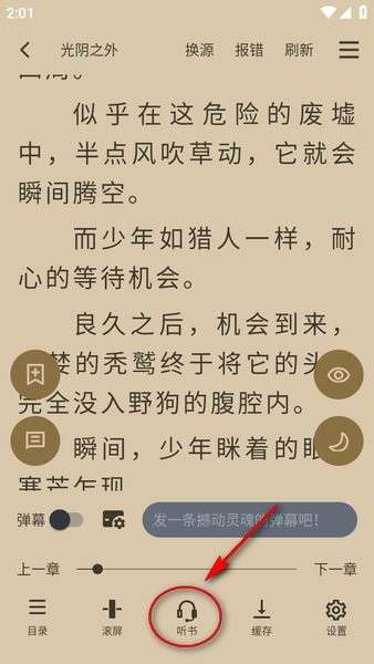 4、进入阅读界面后,点击一下屏幕,就会出现设置,点击底部中间的“听书”。