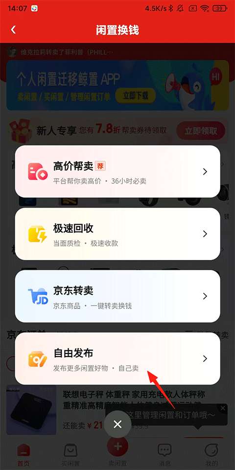 2、进入个人闲置页后点击屏幕正下方的【卖闲置】按钮-选择售出方式,以【自由发布】为例。
