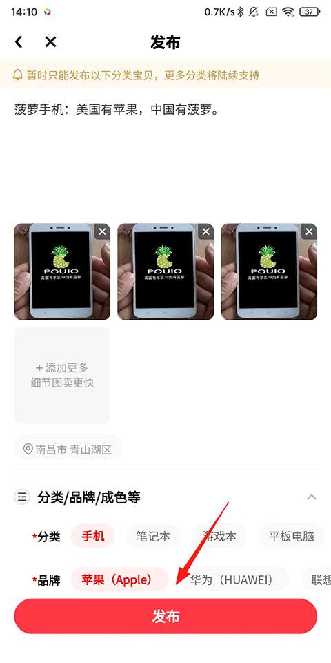 3、输入商品描述、上传相关图片,勾选分类/品牌/成色等,完成后点击【发布】。