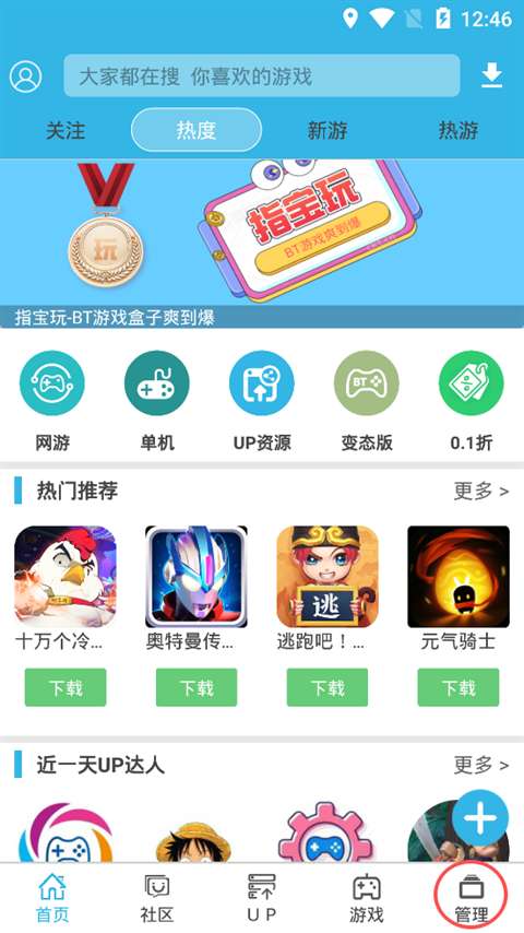 4、首页涵盖网游、单机、up主资源以及变态bt版游戏,还有h5小游戏,任您随心挑选。
