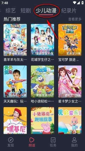 3、导航条往右滑动,还有个“少儿动漫专区”,这个是专门为小朋友准备的;