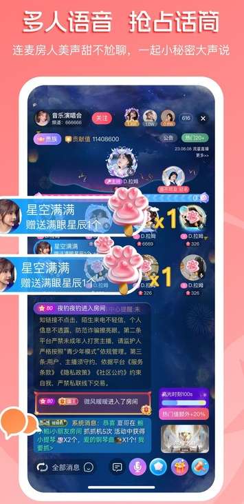 1、多人语音连接:支持8个人同时在线语音,房间类型包括情感聊天、游戏开场黑、K歌房间等。