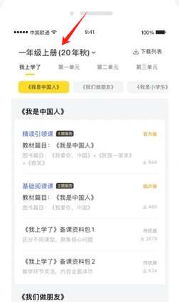 2、点击一年级上册界面,呈现单元主题,如我是中国人,含精读引领等多种学习资料。