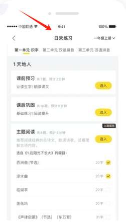 3、点击日常练习页面针对一年级上册,分课前预习、课后巩固、主题阅读等,有具体练习篇目。