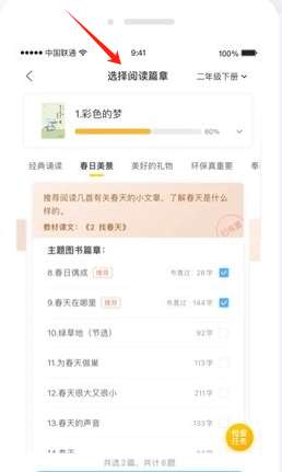 1、点击选择阅读篇章页面,展示二年级下册内容,如彩色的梦,还有推荐阅读篇目。