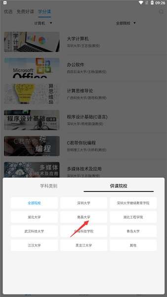 3、在上方有一个全部学科以及供课院校,选择你相对应的学习课程以及学校,这里以南昌大学为例子。