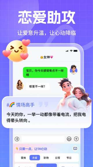 1、【恋爱助攻】多种聊天人设自由切换,生成心动话术,爱情甜蜜升级。