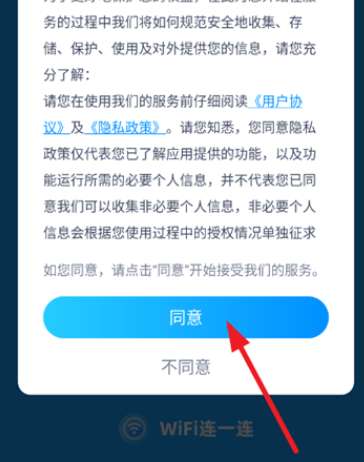 1、打开WiFi一键连应用程序,首次使用时,您需要阅读并同意“用户协议”和“隐私政策”;