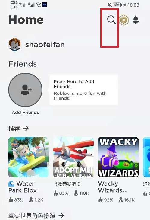 2、登陆游戏,登陆成功之后,点击游戏首页界面的上方的【搜索】,然后进入到搜索界面中。