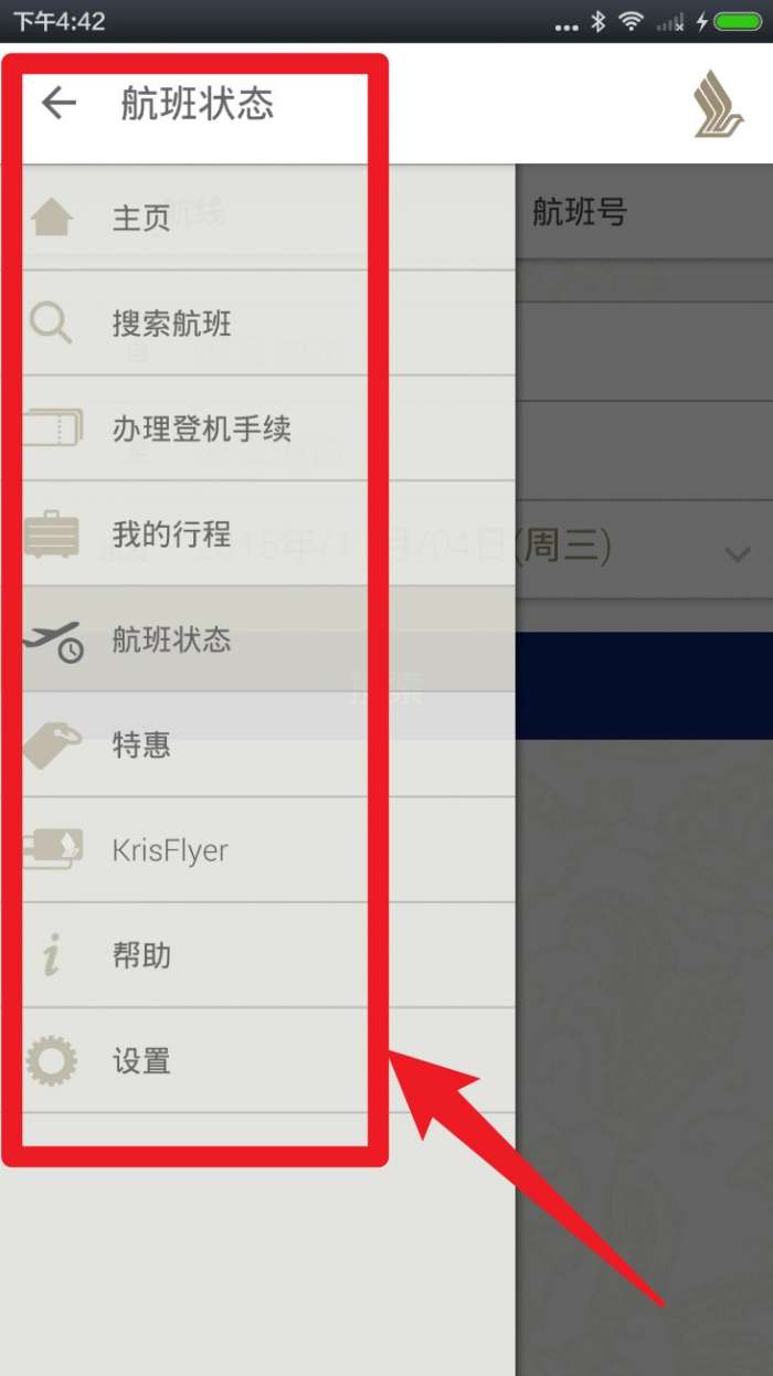 1、打开App后点击左上角菜单图标,选择“航班状态”即可进入实时查询页面。