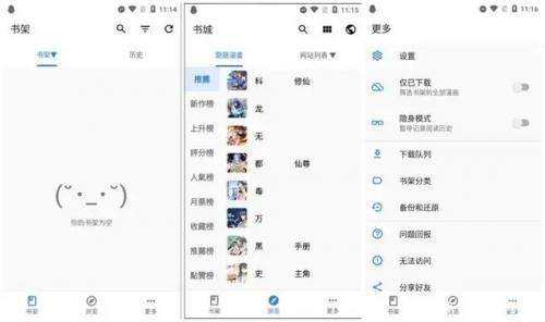这款应用界面十分整洁,下方菜单栏分为书架、浏览、更多三个菜单。菜单栏其中书架可以存储常看漫画书名,当你喜欢一本漫画时,可以将其加入书架方便下次快速找到并阅读;浏览是发现或搜索全网漫画的菜单,可以在这个页面搜索你喜欢的漫画;更多菜单是对这款APP进行软件设置,有隐身模式以及备份还原功能。