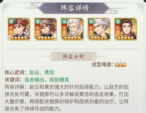 阵容组成:赵云+关银屏+黄忠+庞统+刘备