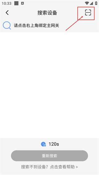 2、进入“搜索设备”页面后,点击右上角的相应图标,将弹出功能选项的弹出窗口,表示需要绑定主网关。