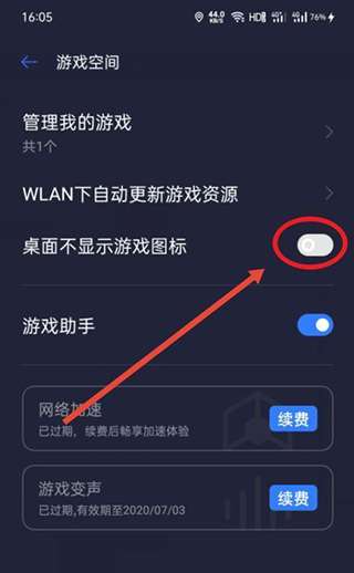 5、添加后,在游戏空间界面,点击桌面不显示游戏图标的开关;