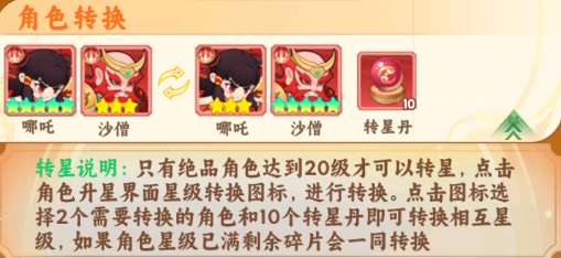 操作:在转星界面选2个绝品角色+消耗10个转星丹,就能互换这两个角色的星级(包括星级已满的剩余碎片也会一起转换)。