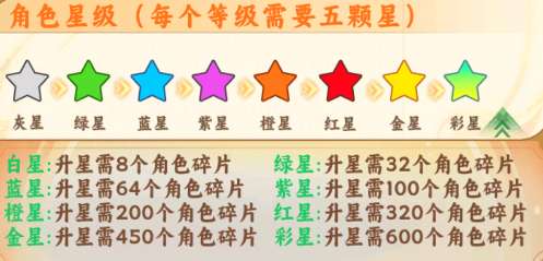 每个星级需要攒对应数量的角色碎片,星级等级从低到高为: