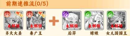 阵容说明:齐天大圣高攻击,自身带回复,放在前排抗伤害,后羿高伤害带点燃在后输出加速推关。秦广王可根据生命力追加伤害打妖王伤害高,自身还有无敌效果。嫦娥,女儿国国王,负责治疗,同时还能提供攻击,暴击。