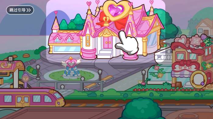 2、跟随引导,点击粉色城堡,解锁小镇场景,可【跳过引导】快速探索,熟悉建筑功能。